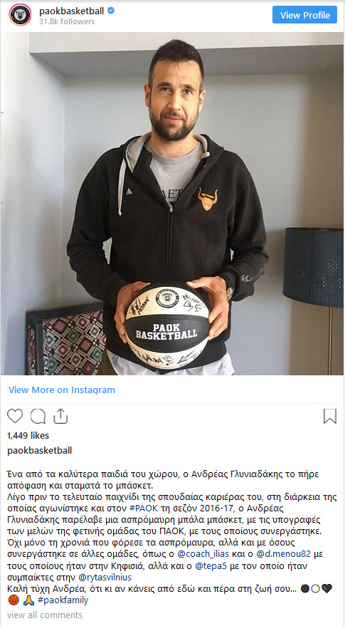Τον Ανδρέα Γλυνιαδάκη, ο οποίος θα «γράψει» σήμερα στο Αλεξάνδρειο με το Ρέθυμνο, στην αναμέτρηση για την 26η «στροφή» της Basket League, με τον Άρη (17.30), τα τελευταία… αγωνιστικά του χιλιόμετρα στο παρκέ, ως αθλητής, τίμησε με ιδιαίτερο τρόπο η ΚΑΕ ΠΑΟΚ.
