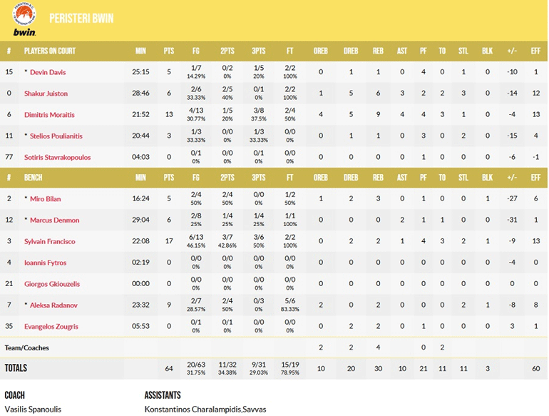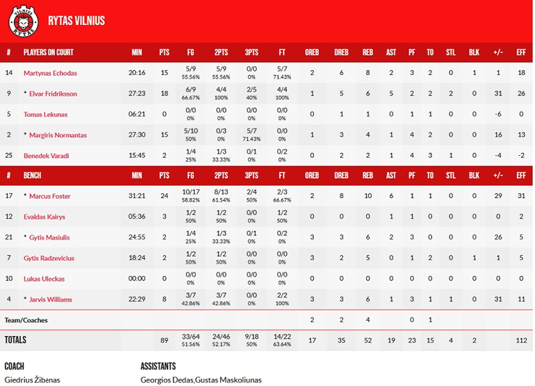 Με 24 πόντους, 10 ριμπάουντ και 6 ο γνώριμος μας από τη θητεία του στον Παναθηναϊκό, Μάρκους Φόστερ, πρωταγωνίστησε στο παιχνίδι των Λιθουανών, ενώ 18 πόντους πρόσθεσε ο Έλβαρ Φρίντρικσον. Από το Περιστέρι, ξεχώρισε ο Σιλβέιν Φρανσίσκο με 17 πόντους.