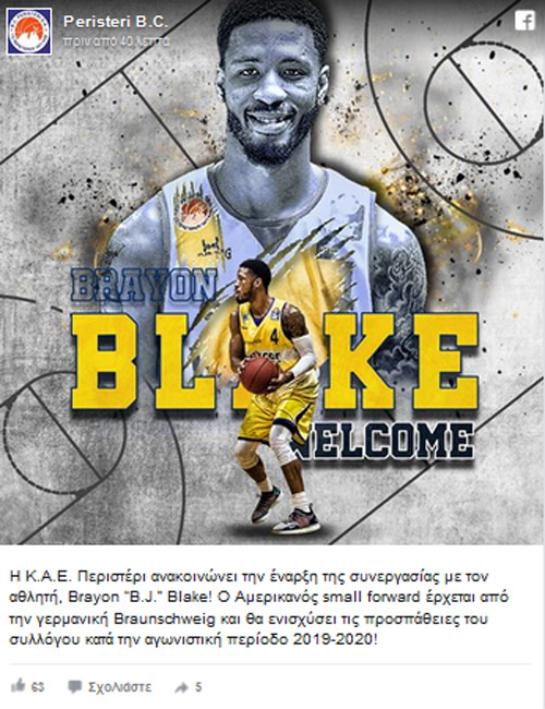 «Η Κ.Α.Ε. Περιστέρι ανακοινώνει την έναρξη της συνεργασίας με τον αθλητή, Brayon “B.J.” Blake! O Αμερικανός small forward έρχεται από την γερμανική Braunschweig και θα ενισχύσει τις προσπάθειες του συλλόγου κατά την αγωνιστική περίοδο 2019-2020!