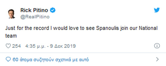 Την επιθυμία του να δει εκ νέου τον Βασίλη Σπανούλη να αγωνίζεται με τη φανέλα της Εθνικής μας ομάδας μπάσκετ επιβεβαίωσε με ποστάρισμά του στο twitter o Ρικ Πιτίνο.
