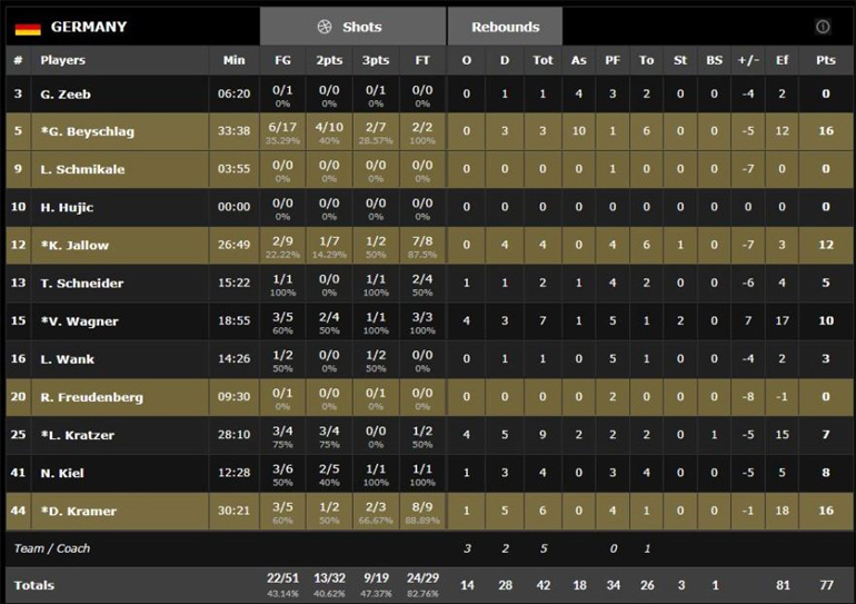 Τα τρίποντα της Γερμανίας και οι δεύτερες ευκαιρίες που πήρε από τα ριμπάουντ ήταν αυτά που βοήθησαν την ομάδα του Χένρικ Ροντλ να φτάσει από το 4-7 (3’40’’) στο 13-7 (5’50’’) και από εκεί στο 16-9 (6’20’’). Η ελληνική ομάδα βρέθηκε να κυνηγάει, μείωσε (27-24, 13’40’’), αλλά στο σημείο αυτό οι διαιτητές, ενώ είχε την κατοχή, έδωσαν επιθετικό φάουλ στον Νίκο Δίπλαρο και στη συνέχεια τεχνική ποινή.