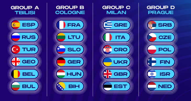 1ος Όμιλος (Τιφλίδα, Tbilisi Arena/Sports Palace): Γεωργία, Μαυροβούνιο, Ισπανία, Βουλγαρία, Βέλγιο, Τουρκία