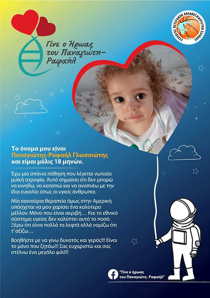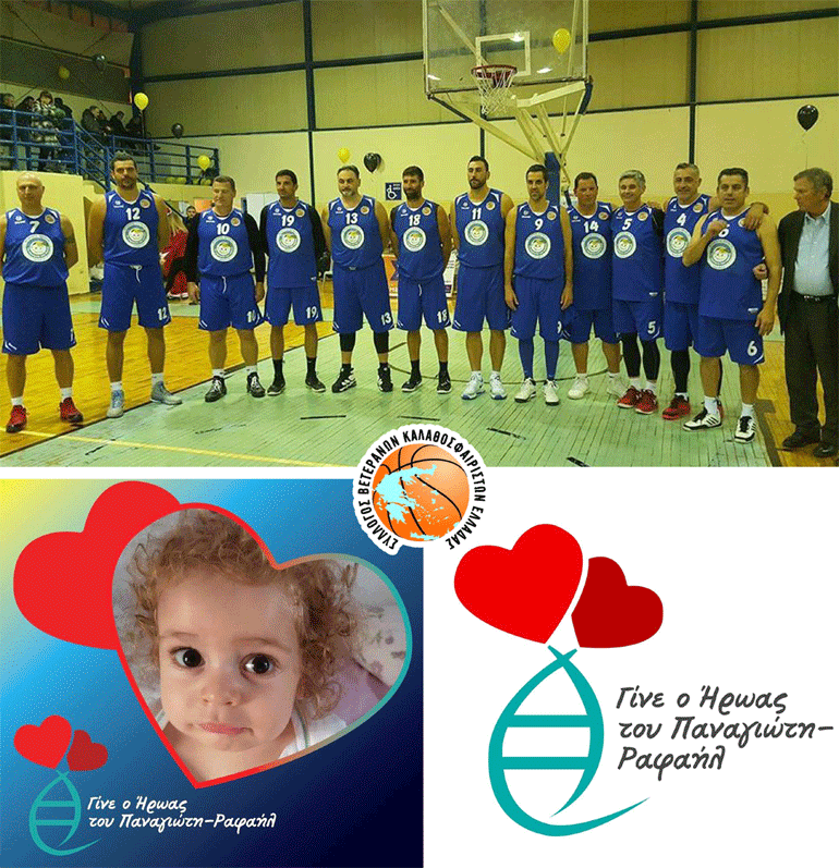 Οι Βετεράνοι Καλαθοσφαιριστές Ελλάδας δέχτηκαν με ενθουσιασμό την πρόσκληση του Νίκου Οικονόμου για ένα φιλανθρωπικό αγώνα μπάσκετ με κοινό στόχο τη στήριξη του μικρού Παναγιώτη Ραφαήλ: ενός μικρού «μαχητή της ζωής», που είναι 18 μηνών και πάσχει από νωτιαία μυϊκή ατροφία τύπου 1.