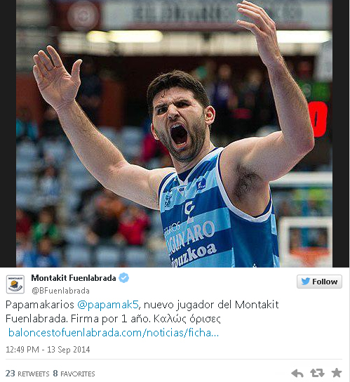 Το χρονικό μίας προαναγγελθείσης μεταγραφής ολοκληρώθηκε το Σάββατο, καθώς η Φουενλαμπράδα ανακοίνωσε κι επίσημα την απόκτηση του Μανώλη Παπαμακάριο, ο οποίος επιστρέφει στο ισπανικό πρωτάθλημα (ACB) μετά από απουσία ενός έτους.