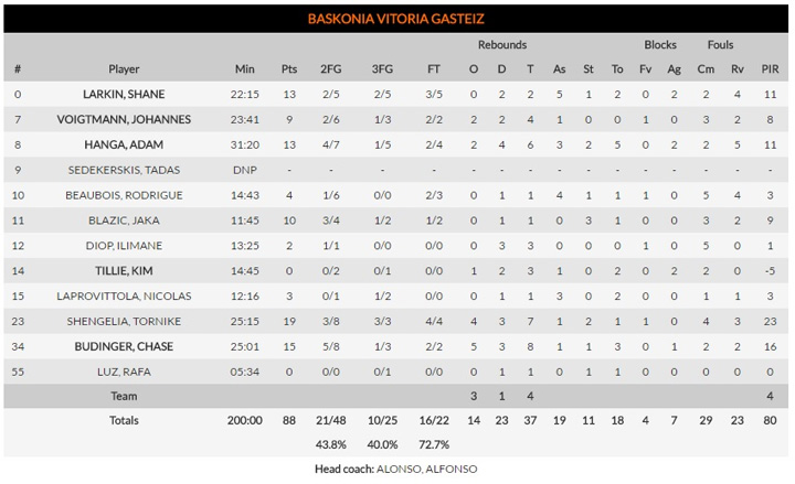 Η ομάδα του Δημήτρη Ιτούδη «καρδιοχτύπησε» και στον τρίτο προημιτελικό, αλλά τελικά με καλή άμυνα στα τελευταία δευτερόλεπτα δεν επέτρεψε στους Βάσκους, που είχαν βρεθεί στο -10 στο 37΄ (74-84), την ολοκλήρωση της ανατροπής. Μεγάλος πρωταγωνιστής των θριαμβευτών ο Κόρι Χίγκινς με 21 πόντους.