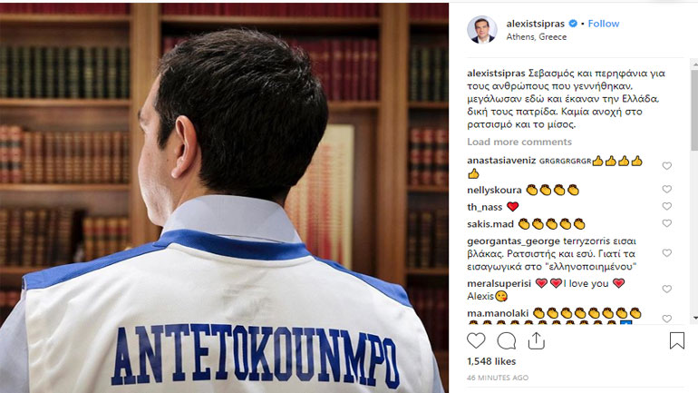 Τη στήριξη στους αδελφούς Αντετοκούνμπο εξέφρασε ο πρωθυπουργός. Σε φωτογραφία που ανήρτησε στο Instagram ο Αλέξης Τσίπρας καταδίκασε τη ρατσιστική επίθεση που δέχθηκε ο Θ. Αντετοκούνμπο φορώντας τη φανέλα που φορά ο μπασκετμπολίστας στην Εθνική Ελλάδας.