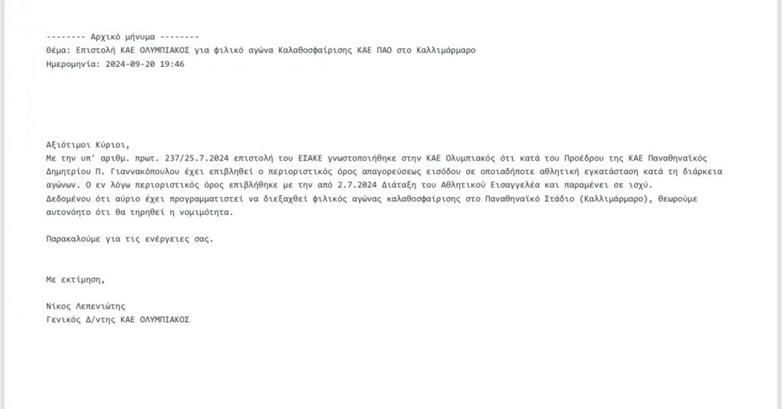 Ωστόσο εκεί δεν κατάφερε να βρεθεί ο ιδιοκτήτης της ομάδας για να τιμήσει τη μνήμη του πατέρα του αφού όπως έγινε γνωστό στην εκπομπή του OPEN ”11 αυτοί 11 εμείς”, ο Ολυμπιακός έστειλε επιστολή στον ΕΣΑΚΕ για να μην μπορέσει να βρεθεί στο γήπεδο, καθώς είχε απαγόρευση εισόδου για τα όσα είπε στους τελικούς της περσινής σεζόν. Αξίζει να σημειωθεί πως τόσο η Ομοσπονδία αλλά και η διοίκηση των ερυθρόλευκων, είχαν πρόσκληση να βρεθούν στην εκδήλωση αλλά δεν το έπραξαν.