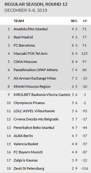 Στη Μόσχα, η ΤΣΣΚΑ χρειάστηκε το επιπλέον πεντάλεπτο της παράτασης (69-69κ.α.) και την ευστοχία του Μάικ Τζέιμς στην εκπνοή για να κόψει πρώτη το νήμα του τερματισμού, απέναντι στην Ζαλγκίρις Κάουνας. Η πρωταθλήτρια Ευρώπης επικράτησε με 85-82 των Λιθουανών, αυξάνοντας σε 8-4 το ρεκόρ της και υποχρεώνοντας τους φιλοξενούμενους στην έκτη διαδοχική ήττα και ένατη στο σύνολο.