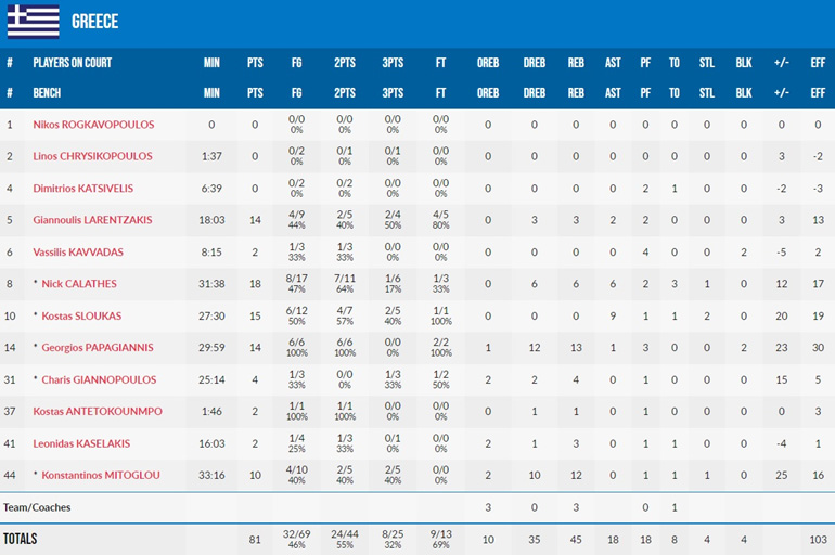 Κορυφαίος ήταν ο Νικ Καλάθης με 18 πόντους, 6 ριμπάουντ κι 6 ασίστ, ενώ άξιος συμπαραστάτης ήταν ο Κώστας Σλούκας με 15 πόντους και 9 ασίστ. «Κλειδί» αποδείχθηκε ο Γιαννούλης Λαρεντζάκης με 14 πόντους, ο οποίος «ξύπνησε» τους συμπαίκτες του την κατάλληλη στιγμή. Παράλληλα, ο Παπαγιάννης έκανε μεγάλο παιχνίδι με 14 πόντους και 13 ριμπάουντ, ενώ ο Μήτογλου ολοκλήρωσε το ματς με 10 πόντους και 12 ριμπάουντ.