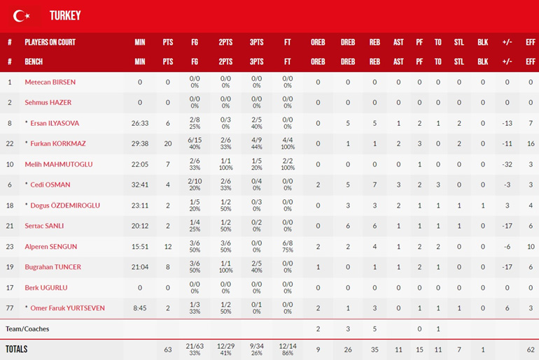 Για την Τουρκία ο Φουρκάν Κορκμάζ μέτρησε 20 πόντους με 4/9 τρίποντα.