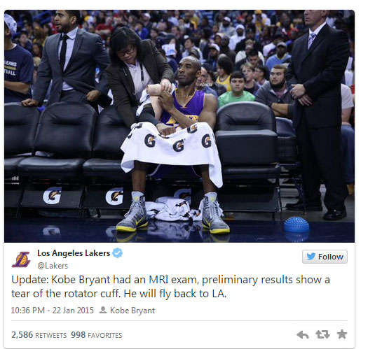 Ρήξη στροφικού πετάλου στον ώμο του δεξιού του χεριού υπέστη ο Κόμπι Μπράιαντ σύμφωνα με ανακοίνωση των Λος Άντζελες Λέικερς στο Twitter.