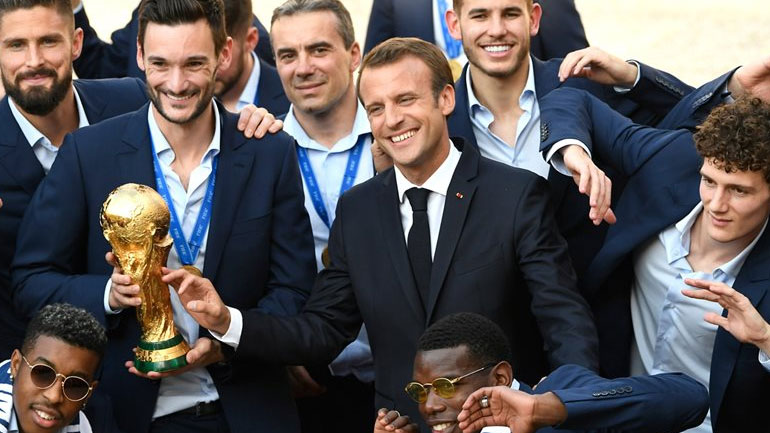Ο Γάλλος πρόεδρος έλαμπε από χαρά όπως και η σύζυγός του Μπριζίτ, που έβγαλε μαζί με τους θριαμβευτές της Ρωσίας αρκετές αναμνηστικές φωτογραφίες.