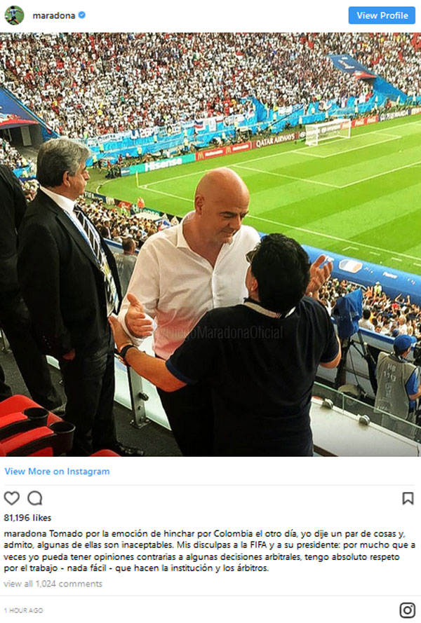 Πιο συγκεκριμένα ο παλαίμαχος Αργεντινός άσος με ανάρτησή του στο Instagram, στην οποία μάλιστα απεικονίζεται με τον πρόεδρο της FIFA Τζιάνι Ινφαντίνο, απολογήθηκε για αυτές τις δηλώσεις του, χαρακτηρίζοντας όσα είπε απαράδεκτα.
