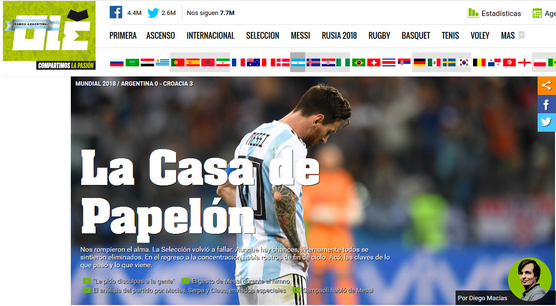«Η Αργεντινή υπέστη μια ταπεινωτική ήττα από την Κροατία και είναι στα πρόθυρα του αποκλεισμού» ανέφερε η ψηφιακή έκδοση της «Ole», επιλέγοντας μία φωτογραφία του τερματοφύλακα της Αργεντινής που καλύπτει το πρόσωπό του γράφοντας: «Ο Καμπαγιέρο της αγωνίας».