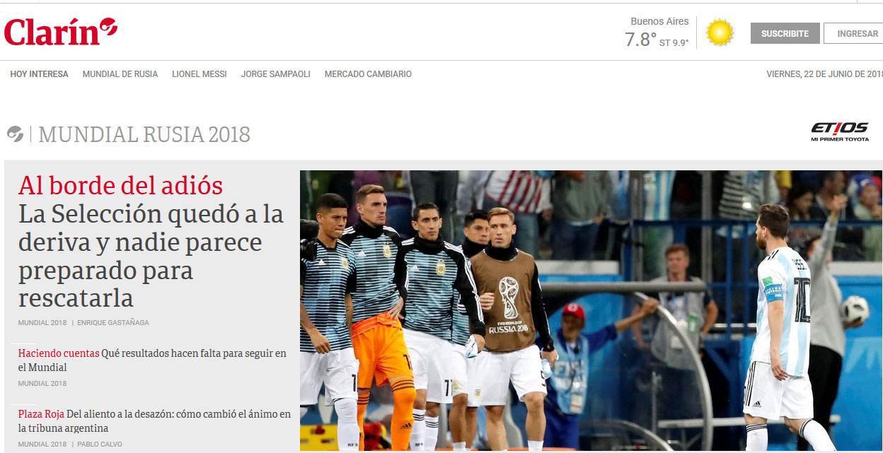 Η «Clarín» έγραψε επίσης: «Καταστροφή ενάντια στην Κροατία. Η Αργεντινή απογοήτευσε και είναι με το ένα πόδι έξω από το Μουντιάλ. Έχασε 3-0 και δεν είχε καμία απάντηση σε οποιαδήποτε στιγμή κατά τη διάρκεια του παιχνιδιού. Ένα πολύ σοβαρό λάθος από τον τερματοφύλακα ήταν η αρχή του εφιάλτη. Ο Μέσι σχεδόν δεν άγγιξε την μπάλα».