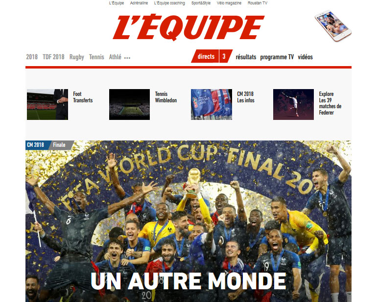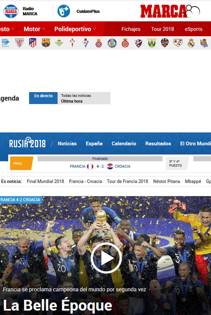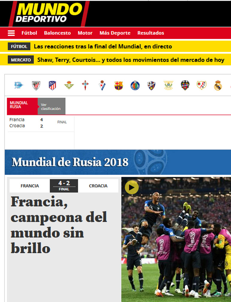 Οι «μπλε» νίκησαν στον τελικό της Μόσχας με 4-2 την Κροατία και πρόσθεσαν το δεύτερο αστέρι στην φανέλα τους. Οι μεγαλύτερες αθλητικές -και όχι μόνο- εφημερίδες του πλανήτη κάνουν λόγο για γαλλικό θρίαμβο στις ιστοσελίδες τους, με την ισπανική Marca να γράφει για «belle epoque» και την αργεντίνικη Clarin να αποδίδει τον τίτλο «φεστιβάλ γκολ».