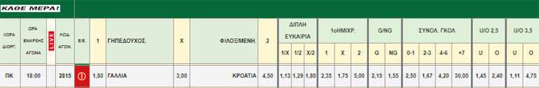 Το Κουπόνι Πάμε Στοίχημα του ΟΠΑΠ έβγαλε τις αποδόσεις για τον τελικό του Μουντιάλ. Απόλυτο φαβορί είναι η Γαλλία η οποία δίνει 1,80 στην επικράτησή της στο ενενηντάλεπτο, ενώ η ισοπαλία πληρώνει με 3. Όσο για την Κροατία η νίκη επιστρέφει 4,5 φορές το αρχικό ποντάρισμα.