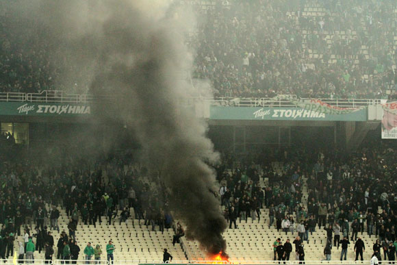Σε εκείνο το σημείο οι οπαδοί του Παναθηναϊκού επιτέθηκαν στα ΜΑΤ, πετώντας ό,τι έβρισκαν μπροστά τους. Φωτιά μπήκε στη Θύρα 4, στη Θύρα 7, την 5 και την 34. Εν τω μεταξύ, το γήπεδο άδειασε, αφού οι φίλαθλοι των «πράσινων» αποχώρησαν από το ΟΑΚΑ.