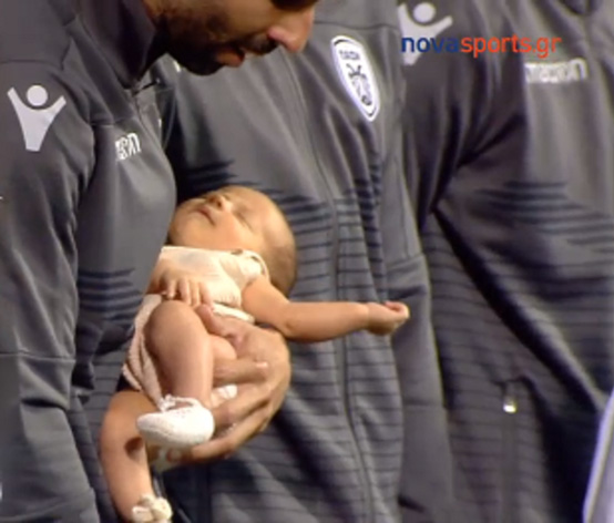 κρατώντας στην αγκαλιά του το νεογέννητο μωράκι του
