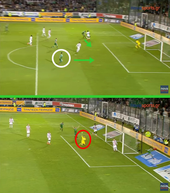 Εδώ βλέπουμε ένα οφ-σάϊντ δουλεμένο στην προπόνηση τού Ολυμπιακού.