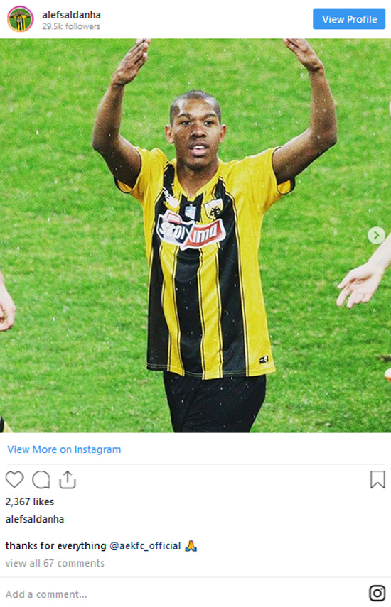 Με ένα λιτό μήνυμα στο Instagram ο Άλεφ Σαλντάνια αποχαιρέτησε την ΑΕΚ, στην οποία αγωνίστηκε την περασμένη σεζόν ως δανεικός από τη Μπράγκα.