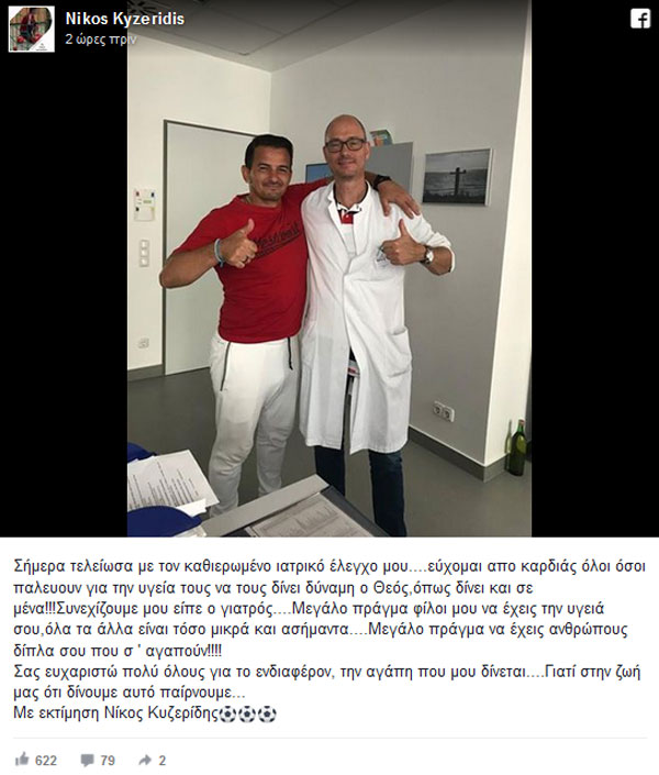 «Σήμερα τελείωσα με τον καθιερωμένο ιατρικό έλεγχο μου…. Εύχομαι από καρδιάς όλοι όσοι παλεύουν για την υγεία τους να τους δίνει δύναμη ο Θεός,όπως δίνει και σε μένα!!!