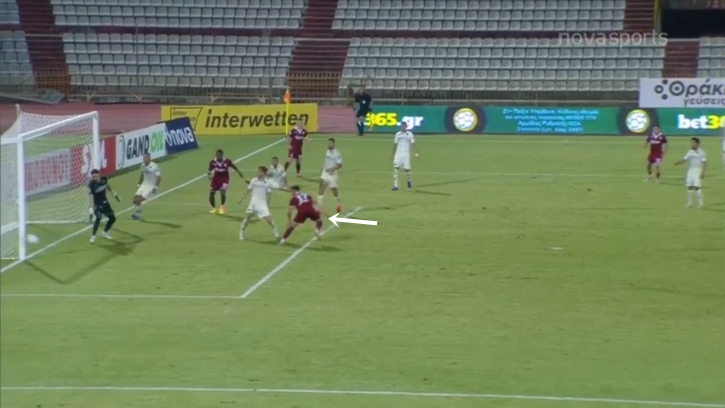 Τεράστιο κενό στην άμυνα, παίκτης αφύλακτος στο πίσω δοκάρι, κεφαλιά στη δεξιά γωνία,