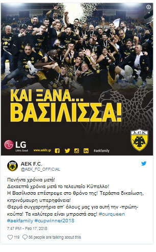 Λίγα λεπτά μετά τη νίκη επί του Ολυμπιακού στον τελικό Κυπέλλου η ποδοσφαιρική ΑΕΚ έσπευσε να συγχαρεί την μπασκετική για την κατάκτηση του τροπαίου.