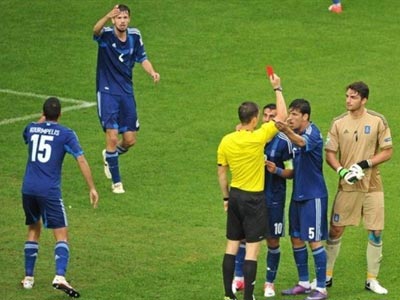 Εντούτοις στο 45′ ο διαιτητής του αγώνα, Κεν Χάνσεν αποφάσισε να γίνει ο αρνητικός πρωταγωνιστής του αγώνα, εις βάρος της ελληνικής ομάδας.