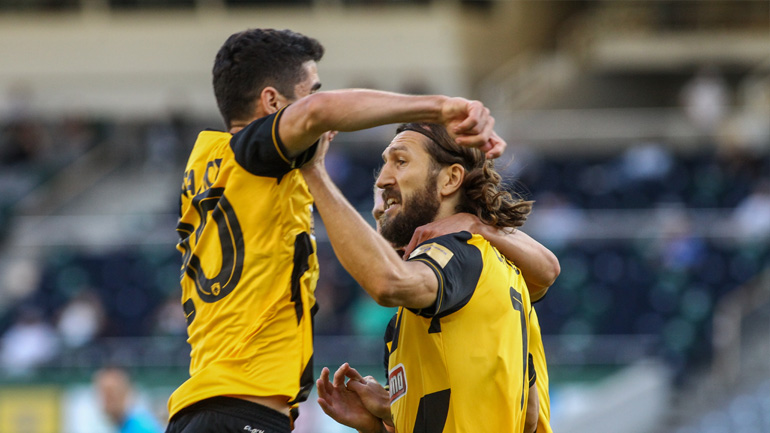Στο 42′ η ΑΕΚ εκμεταλλεύτηκε τα συνεχόμενα ρίσκα που έπαιρναν οι γηπεδούχοι, με κοντινές πάσες πέριξ της περιοχής του Διούδη.
