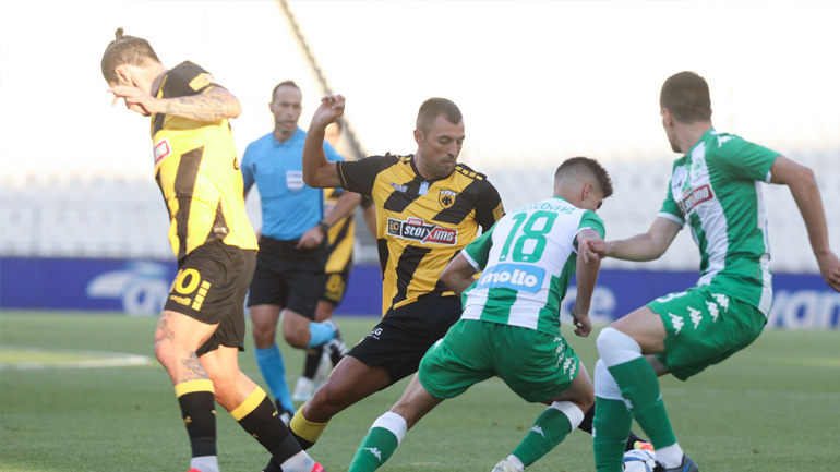 Στο 2′ ο Θεοχάρης από καλή θέση σούταρε πολύ πάνω από τα δοκάρια του Μπάρκα, ενώ πέντε λεπτά αργότερα η ΑΕΚ έφτασε πρώτη στο γκολ.