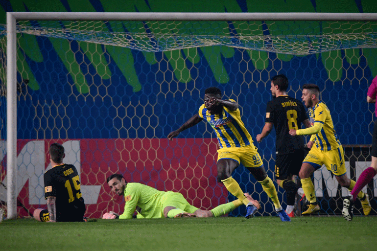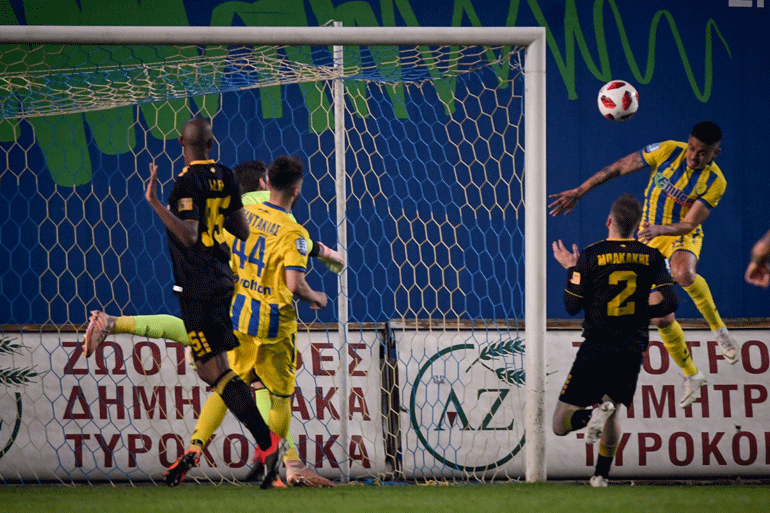 Η ΑΕΚ μείωσε στο 77΄ με κεφαλιά από κοντά του Σιμόες από μεταβίβαση του Πόνσε, σε μια φάση οριακή για τον Πορτογάλο, που ίσως να ήταν οφσάιντ.