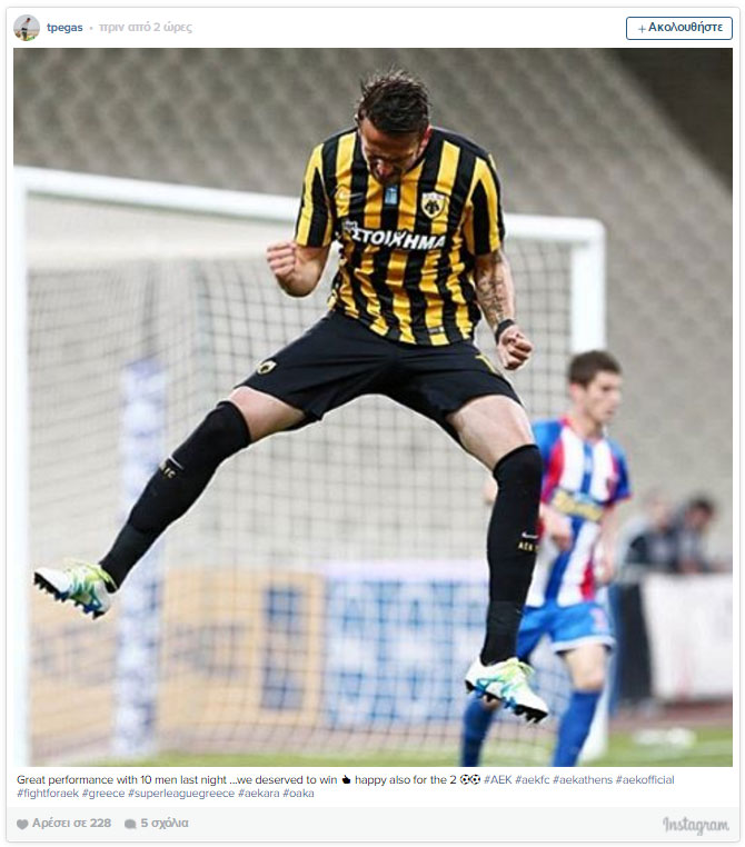 Ο Τόμας Πέκχαρτ σκόραρε δύο φορές στη νίκη της ΑΕΚ επί του Πανιωνίου στο άδειο ΟΑΚΑ και μετά τη λήξη του αγώνα ανέβασε στο Instagram μια φωτογραφία με τον ίδιο να πανηγυρίζει, συνοδεύοντάς τη με το παρακάτω σχόλιο:
