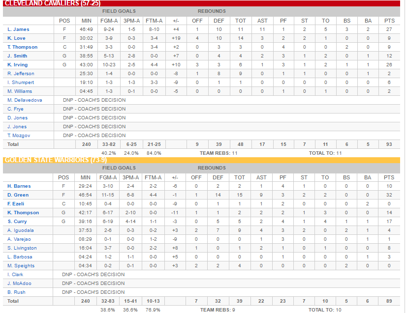 Σε ένα πολύ κλειστό παιχνίδι, με συνεχείς εναλλαγές στο προβάδισμα και με τους «Splash Brothers» να κινούνται σε ρηχά νερά, ήταν ο συγκλονιστικός Ντρέιμοντ Γκριν αυτός που έδινε το σύνθημα για τον δεύτερο σερί τίτλο των Γουόριορς, όμως ‘Ερβινγκ και Τζέημς είχαν άλλη άποψη, με τον τελευταίο να προσθέτει στη συλλογή του το τρίτο «δαχτυλίδι» του.