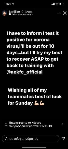 Νοκ-άουτ από το κυριακάτικο ντέρμπι της ΑΕΚ με τον Παναθηναϊκό τέθηκε ο Καρίμ Ανσαριφάρντ, καθώς, όπως γνωστοποίησε ο ίδιος ο παίκτης στον προσωπικό του λογαριασμό στα social media, βρέθηκε θετικός στον κορωνοϊό.