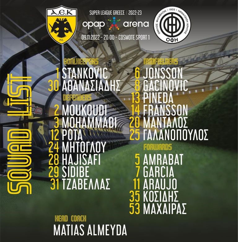 Έτσι την αποστολή για το αυριανό ματς αποτελούν οι: Στάνκοβιτς, Αθανασιάδης, Μουκουντί, Μοχαμάντι, Ρότα, Μήτογλου, Χατζισαφί, Σιντιμπέ, Τζαβέλλας, Γιόνσον, Γκατσίνοβιτς, Πινέδα, Φράνσον, Μάνταλος, Γαλανόπουλος, Άμραμπατ, Γκαρσία, Αραούχο, Κοσίδης, Μαχαίρας