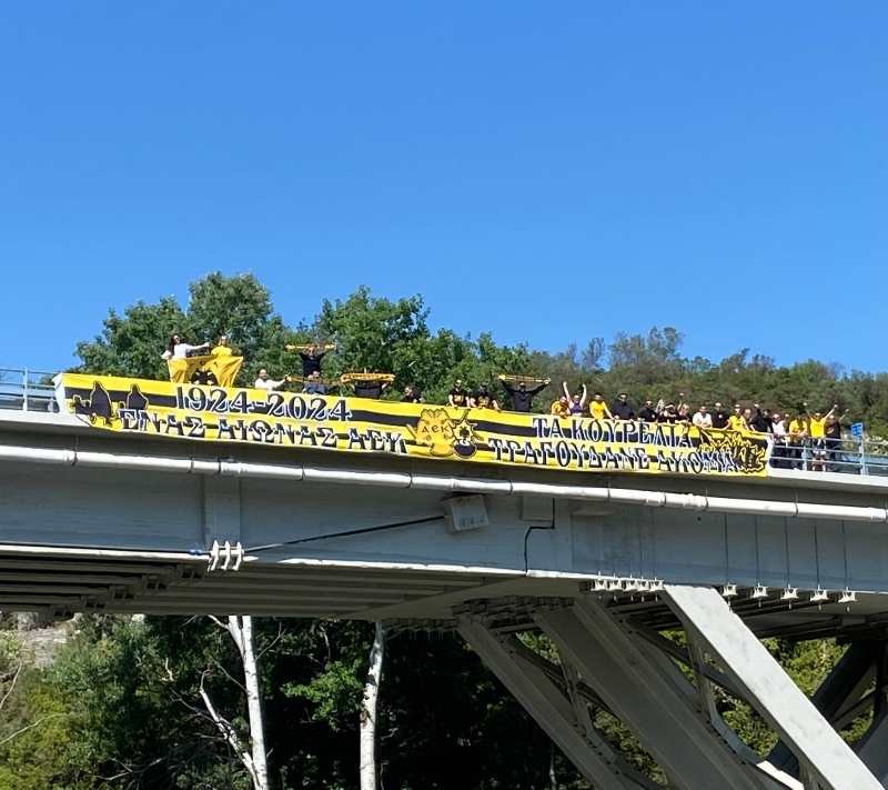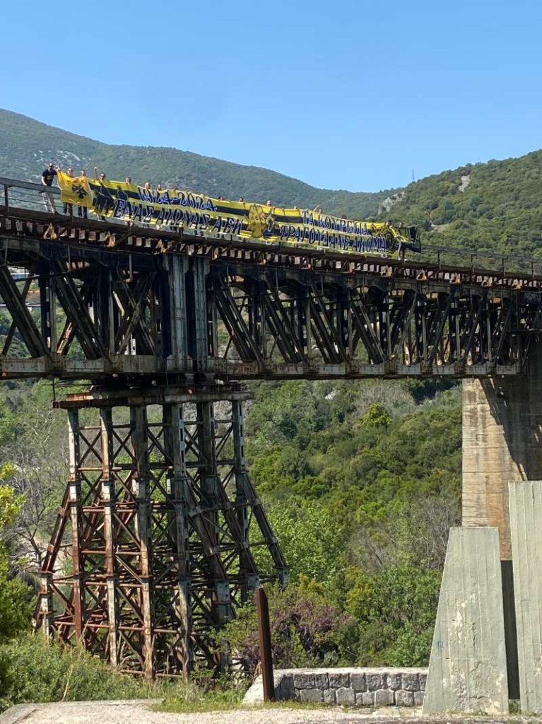 Από τον ΚοRυδαλλό, στα αδέρφια μας στη Λάρισα για να δώσουμε λίγο κίτρινο στο μαύρο των Τεμπών. Δεν θα μπορούσαμε να μην σταθούμε έστω για λίγο προσοχή, μπροστά στο μνημείο των οπαδών του ΠΑΟΚ που έχασαν την ζωή τους, ταξιδεύοντας να δουν την ομάδα τους, ενώ αφήσαμε και μερικά λουλούδια στο μνημείο του δυστυχήματος των Τεμπών, μαζί με την υπόσχεσή μας πως δεν θα επιτρέψουμε να ξεχαστεί το έγκλημα. Η ιστορία μας ως οπαδοί, είναι ταυτισμένη έτσι κι αλλιώς με την πάλη απέναντι στο άδικο σε κάθε μεγάλο κοινωνικό, εθνικό ή πολιτικό ζήτημα. Για τον λόγο αυτό διαλέξαμε και το δεύτερον σημείο στο οποίο απλώθηκε το 21μετρο πανό μας.