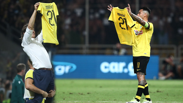 Συγκινητικές στιγμές διαδραματίστηκαν στην OPAP Arena με τους Σέρχιο Αραούχο και Ματίας Αλμέιδα να σηκώνουν τη φανέλα με το όνομα του 29χρονου αδικοχαμένου φίλου της ΑΕΚ, Μιχάλη.