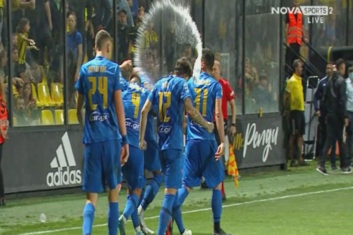 Δευτερόλεπτα μετά την επίτευξη του πρώτου γκολ της «Ένωσης» κι ενώ οι παίκτες του «δικεφάλου» πανηγύριζαν ένας ανεγκέφαλος οπαδός των γηπεδούχων προχώρησε σε αυτήν την απαράδεκτη ενέργεια.