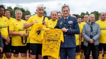 Ο Στέλιος Μανωλάς, θα ηγηθεί της “κιτρινόμαυρης” αποστολής στη Λειβαδιά: στη φωτογραφία, δίνει στον αρχηγό του Γ. Ε. Αεροπορίας, Αντιπτέραρχο Δημοσθένη Γρηγοριάδη, δώρα από τους βετεράνους της ΑΕΚ, από την πρόσφατη εκδήλωση γιορτής του Γ.Ε.Α. στις 8 Νοεμβρίου