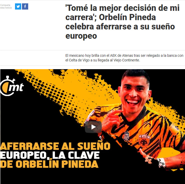 Απόλυτα δικαιωμένος με την απόφασή του να φορέσει τη φανέλα της ΑΕΚ δήλωσε ο Ορμπελίν Πινέδα, σε συνέντευξη που παραχώρησε στην ιστοσελίδα της πατρίδας του, την Mediotiempo, όπου μίλησε για τις δυσκολίες που συνάντησε στο ευρωπαϊκό του ξεκίνημα με τη Θέλτα, την… μετακόμιση στην «Ένωση», το ποδόσφαιρο στη Ελλάδα και το μέλλον του.