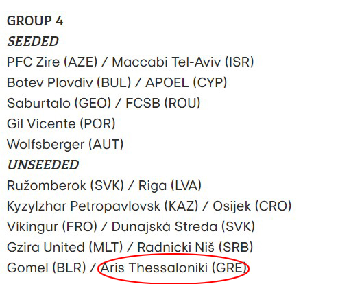 Αντίστοιχα, ο Άρης, ο οποίος βρίσκεται στους ανίσχυρους της κλήρωσης, τοποθετήθηκε μαζί με τη Γκόμελ στο τέταρτο υπογκρουπ και έχει ως υποψήφιους αντιπάλους, την πορτογαλική Ζιλ Βιθέντε, την αυστριακή Βολφσμπέργκερ και έναν εκ των νικητών από τα ζευγάρια: