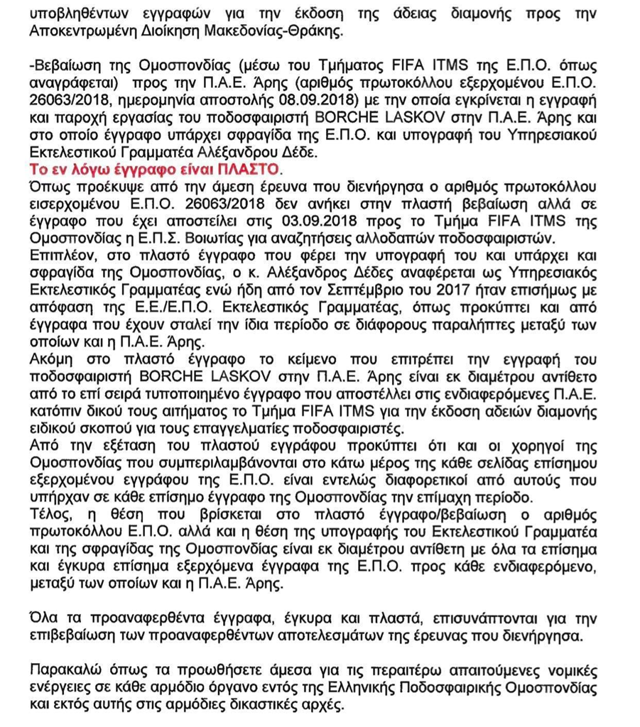 Ειδικότερα, η έρευνα των Εισαγγελικών Αρχών φέρεται να αφορά την πλαστότητα του εγγράφου της ΕΠΟ προς τον Άρη (πλαστογράφηση σφραγίδας και υπογραφής), καθώς και την κατασκευή ενός εικονικού συμβολαίου που δεν κατατέθηκε ποτέ στην ΕΠΟ ή τη Super League.