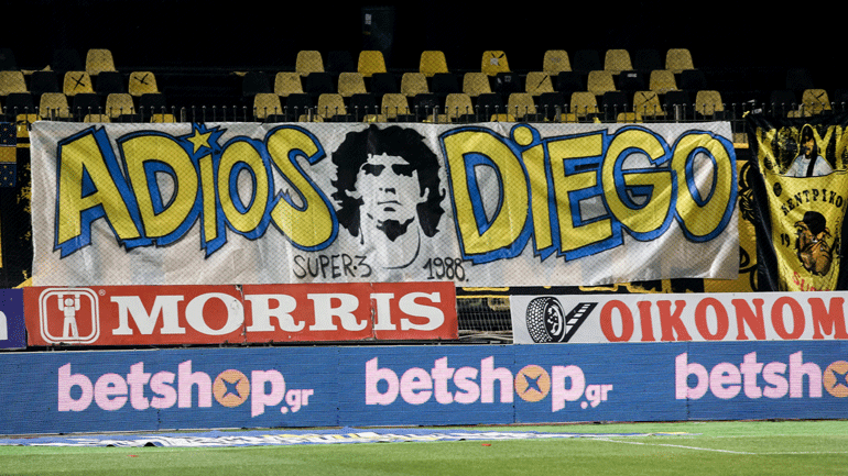 ***Πανό αφιερωμένο στον Ντιέγκο Αρμάντο Μαραντόνα, που έφυγε από τη ζωή σε ηλικία 60 ετών την περασμένη Τετάρτη (25/11), κρέμασαν στα κάγκελα της Θύρας 3 οι φίλοι του Άρη.