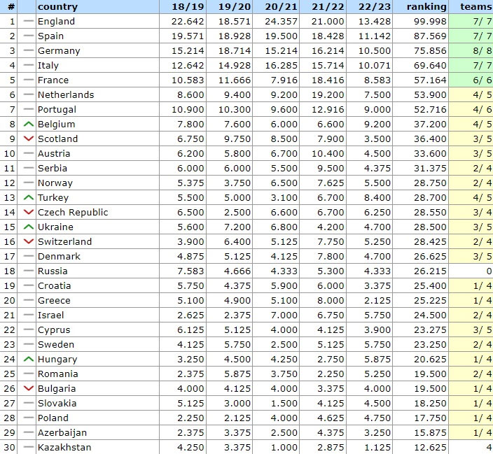 Πλέον απειλούμαστε από τις χώρες που μας ακολουθούν όπως για παράδειγμα την Κύπρο, που είναι 22η με 23.275 και θα έχει την ΑΕΚ Λάρνακας στο Conference League, ενώ το 21ο Ισραήλ μπορεί να έχει από δύο (Μακάμπι Χάιφα – Χαποέλ Μπερ Σεβά) έως καμία, ενώ φυσικά η διαφορά με τις ομάδες που βρίσκονται σε πιο προνομιακές θέσεις θα αυξηθεί.