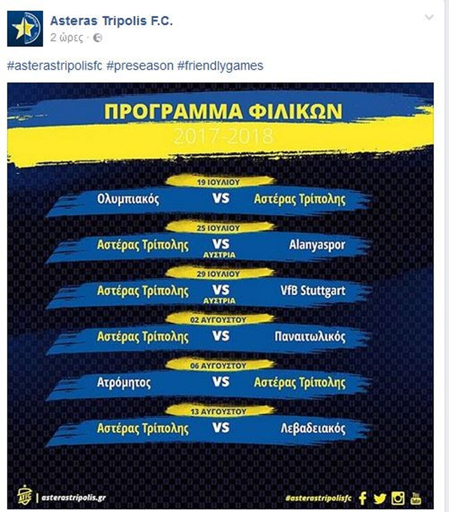 Ο Αστέρας Τρίπολης ανακοίνωσε τα φιλικά της προετοιμασίας του, που ξεκινούν με το ματς απέναντι στον Ολυμπιακό στο «Γ. Καραϊσκάκης» στις 19 Ιουλίου. Οι Αρκάδες του Στάικου Βεργέτη θα αντιμετωπίσουν ακόμα τον Παναιτωλικό, τον Ατρόμητο, τη γερμανική Στουτγκάρδη και την τουρκική Αλάνιασπορ.