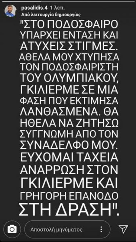 Ο παίκτης των Αρκάδων μετά τη λήξη του αγώνα ζήτησε συγγνώμη από τον μέσο των Πειραιωτών με μία ανάρτηση στα stories του instagram, γράφοντας σε αυτήν:
