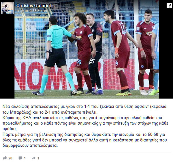 «Νέα αλλοίωση αποτελέσματος με γκολ στο 1-1 που ξεκινάει από θέση οφσάιντ (κεφαλιά του Μπαράλες) και το 2-1 από ανύπαρκτο πέναλτι. Κύριοι της ΚΕΔ αναλογιστείτε τις ευθύνες σας γιατί πηγαίνουμε στην τελική ευθεία του πρωταθλήματος και ο κάθε πόντος είναι σημαντικός για την επίτευξη των στόχων της κάθε ομάδας. Πάρτε μέτρα για τη βελτίωση της διαιτησίας και θωρακίστε την ισονομία και το 50-50 για όλες τις ομάδες γιατί δεν μπορεί να συνεχιστεί άλλο αυτή η κατάσταση με διαιτησίες που διαμορφώνουν αποτελέσματα», γράφει συγκεκριμένα ο υπεύθυνος επικοινωνίας της ΠΑΕ.