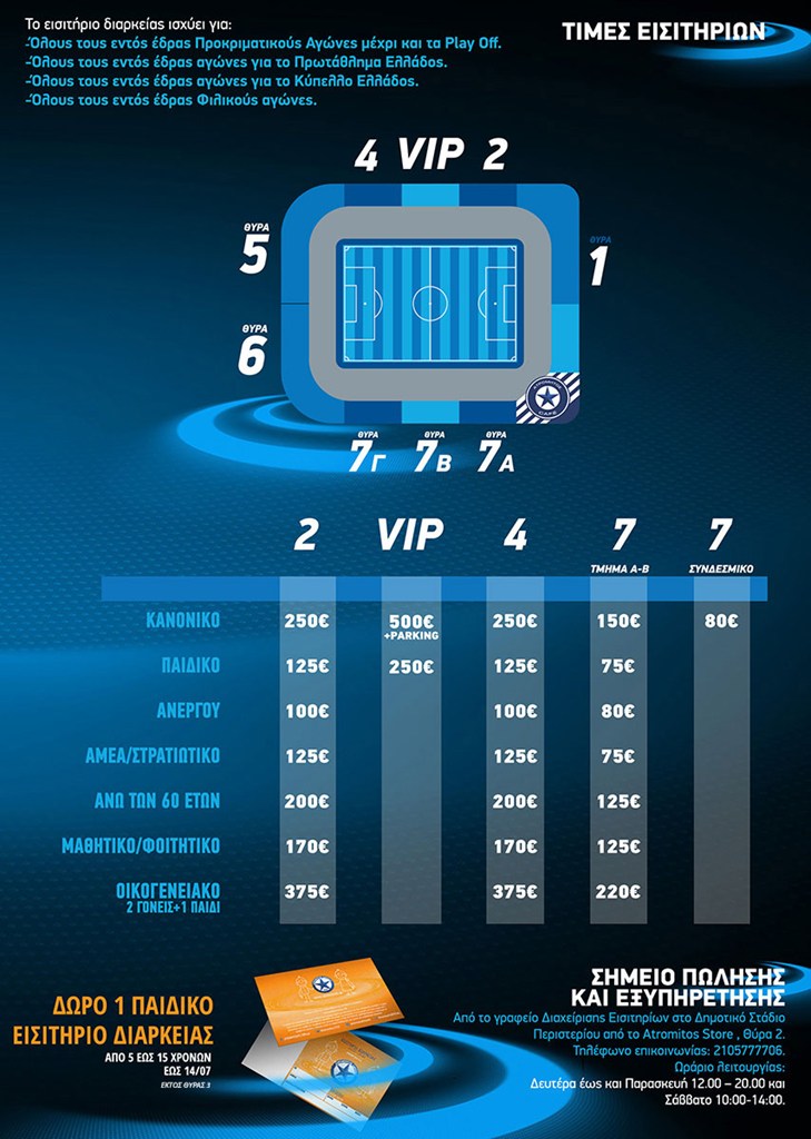 Σημείο πώλησης και εξυπηρέτησης θα είναι το γραφείο Διαχείρισης Εισιτηρίων στο Δημοτικό Στάδιο Περιστερίου (είσοδος από Atromitos store, Θύρα 2), τηλέφωνο επικοινωνίας 2105777706. Ωράριο λειτουργίας Δευτέρα έως και Παρασκευή 12.00 – 20.00 και Σάββατο 10:00-14:00.