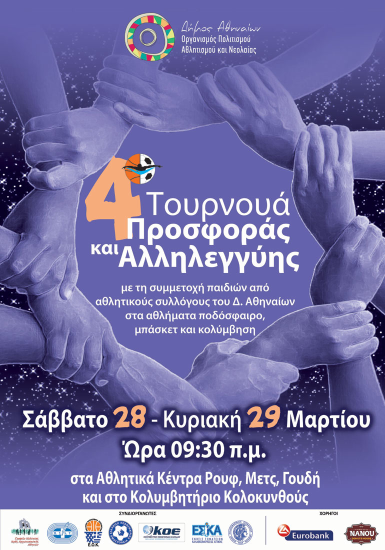 Ο Οργανισμός Πολιτισμού, Αθλητισμού και Νεολαίας του Δήμου Αθηναίων συνδιοργανώνει με την Ιερά Αρχιεπισκοπή Αθηνών, τον Πανελλήνιο Σύνδεσμο Αθλητικού Τύπου (Π.Σ.Α.Τ.), την Ελληνική Ομοσπονδία Καλαθοσφαίρισης (Ε.Ο.Κ.), την Ελληνική Ποδοσφαιρική Ομοσπονδία (Ε.Π.Ο.), την Κολυμβητική Ομοσπονδία Ελλάδας (Κ.Ο.Ε.), την Ένωση Σωματείων Καλαθοσφαίρισης Αττικής (Ε.Σ.Κ.Α.) και την Ένωση Ποδοσφαιρικών Σωματείων Αθηνών (Ε.Π.Σ.Α.), το «4ο Τουρνουά Προσφοράς και Αλληλεγγύης» το Σαββατοκύριακο 28 και 29 Μαρτίου, με την ευγενική χορηγία της Τράπεζας Eurobank Ergasias A.E. και της εταιρίας «Νανού».